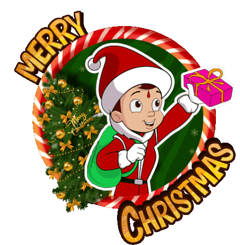Chhota Bheem, dressed as Santa Claus, joyfully presents a gift, spreading Merry Christmas wishes and holiday cheer.