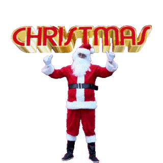 Santa Claus stands with arms raised, celebrating Christmas under a golden 'MERRY' text, perfect for greetings.