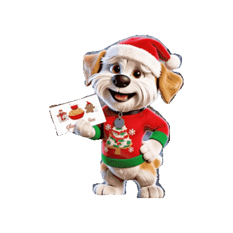Clydeo, the animated dog, wears a Santa hat and Christmas sweater, holding a festive card for Jennifer Aniston.