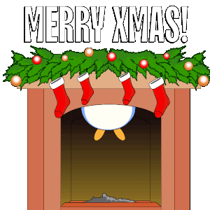 An animated fireplace with hanging Christmas stockings and a festive garland, featuring the text 'MERRY XMAS!' appearing and disappearing.