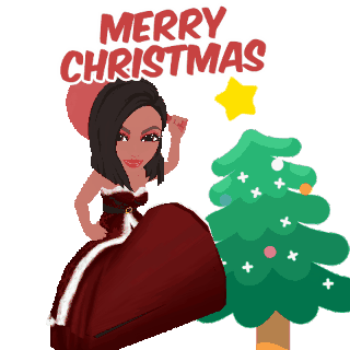 Lignon, Lou, and Saquinon wish "Merry Christmas" with an animated woman in a red dress next to a festive tree.