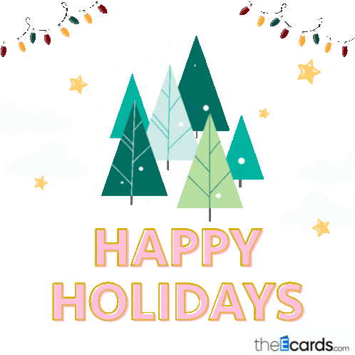 An animated sticker featuring a cluster of stylized Christmas trees, falling snow, string lights, and the text 'Happy Holidays'.