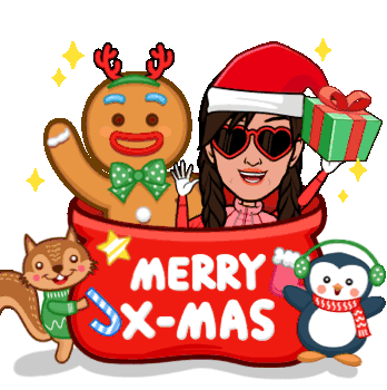 Celebrate Christmas with Vickie, a gingerbread man, a squirrel, and a penguin popping from a festive Merry Xmas bag.