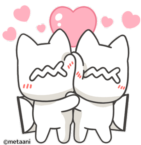 Two adorable Metaani characters hug lovingly, surrounded by pink hearts, expressing deep affection and warmth.