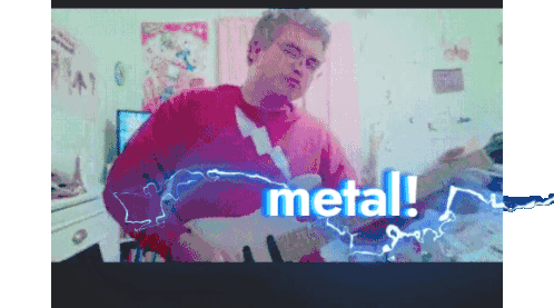 A person in a red shirt energetically plays an electric guitar, surrounded by blue lightning effects and the word 'metal!'.