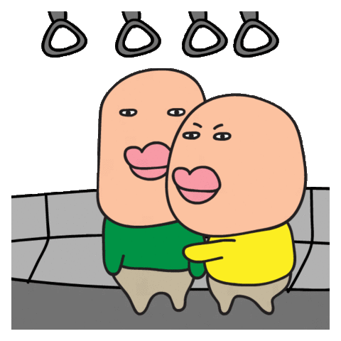 Two quirky cartoon characters on a metro train, one with a surprised expression, the other leaning in close.