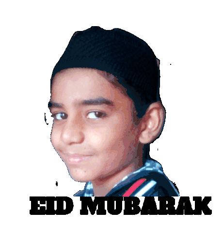 Hashim Baheruni, a young boy, smiles while wishing 'Eid Mubarak' with rotating text, perfect for festive greetings.