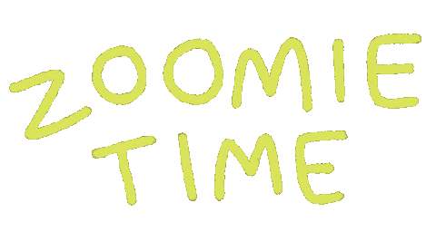 A playful animated sticker featuring the hand-drawn yellow text 'ZOOMIE TIME' on a clean white background.