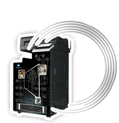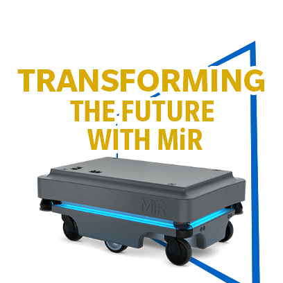 A MiR robot, branded with Konica Minolta, moves forward with the text 'Transforming the Future with MiR'.