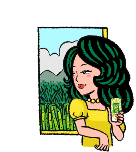 Animated sticker of a woman holding a Míaha drink, smiling by a window overlooking a sugarcane field.