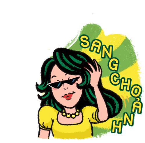 A glamorous cartoon woman, possibly Miaha, with green hair and sunglasses, dramatically flips her hair with 'SAN HOÀNH' text.