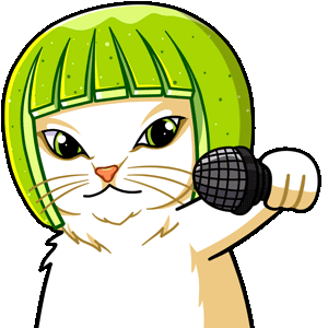 Limecat, a white cat with green hair, holds a microphone in its paw, ready to sing or perform.
