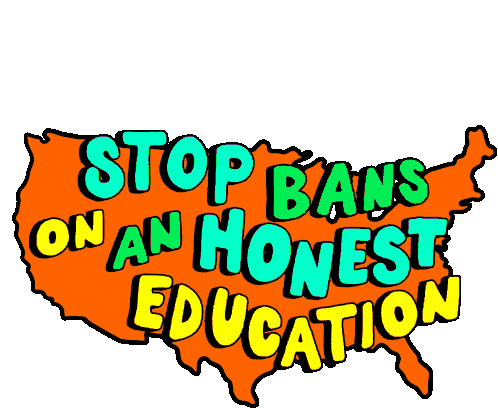 Animated sticker with the message 'STOP BANS ON AN HONEST EDUCATION' overlaid on a map of the United States.