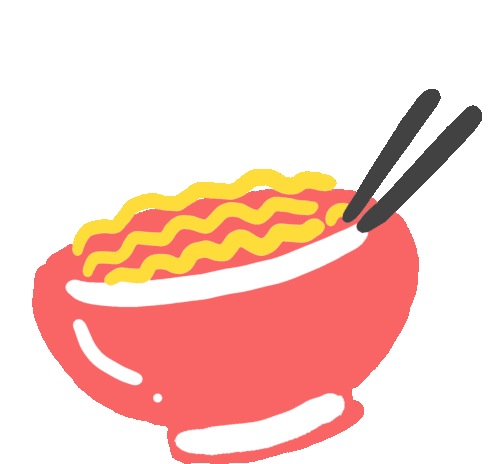 Animated sticker of a red bowl filled with delicious instant noodles, accompanied by chopsticks and sparkling stars.