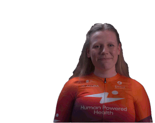 Mieke Kröger, a cyclist from Human Powered Health, smiles and points upwards with both hands, showing enthusiasm.