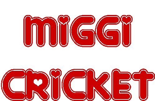 Red text logo for Miggi Cricket, featuring heart accents on the letters 'i' in a playful design.