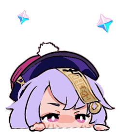 Adorable pixel art animated sticker of Qiqi from Genshin Impact, featuring her signature purple hair and hat.