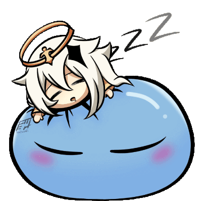Paimon from Genshin Impact is seen peacefully sleeping on a blue Slime, with 'ZZZ' indicating her slumber.
