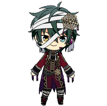 Mika Kagehira from Ensemble Stars! in a cute chibi style, dressed in a mummy-like costume with bandages and a spiderweb accessory.