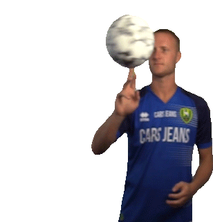 Mike Havekotte, a player for Ado Den Haag, skillfully spins a soccer ball on his finger, showcasing his ball control.