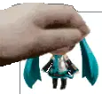Hatsune Miku, the popular vocaloid, performs her iconic leek spin dance with a surprised expression, holding a green onion.