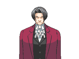Miles Edgeworth from Ace Attorney, looking stern and angry in his signature red suit and cravat.