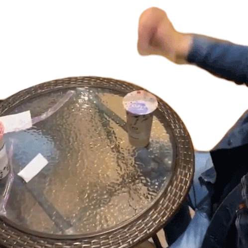 A hand forcefully pushes a cup of milk tea, causing it to burst and spill all over a glass table in a messy explosion.