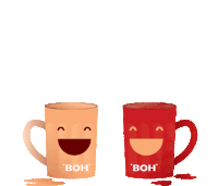 Two cheerful BOH tea mugs clink together in a friendly toast, spilling a bit of their delicious beverage.
