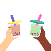 Two diverse hands clink colorful bubble tea cups with boba pearls in a cheerful toast.