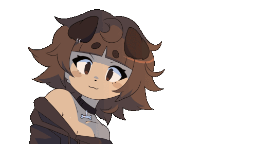 Mimi, a cute animated dog girl character with brown hair and a bone collar, winks playfully.