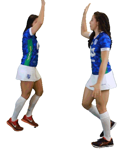 Two female volleyball players from Minas Tenis Clube high-five each other in celebration during a match.