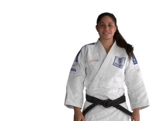 A smiling Minas Tênis Clube judo athlete in a gi and black belt points, representing the spirit of Brazilian judo.
