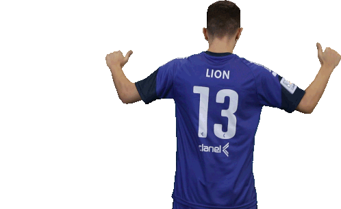 Futsal player Lion from Minas Tênis Clube, wearing jersey number 13, proudly points to his name and number.