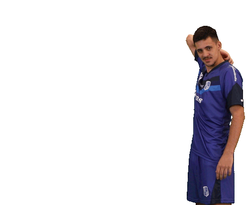 A Minas Tênis Clube futsal player in a blue uniform makes a playful finger gun gesture, pointing forward.