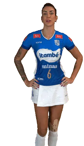 A female volleyball player from Minas Tênis Clube, wearing a blue and white uniform with number 3, flexes her arms.