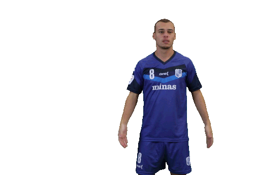 A futsal player from Minas Tênis Clube in a blue uniform makes a 'what can I do?' gesture, shrugging with open hands.
