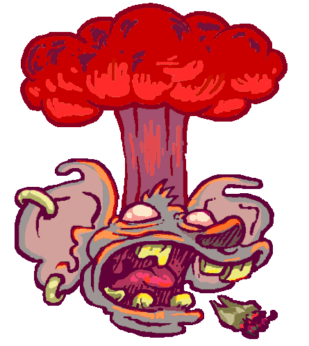 A cartoon monster with a red mushroom cloud explosion from its head, depicting a mind-blown reaction.