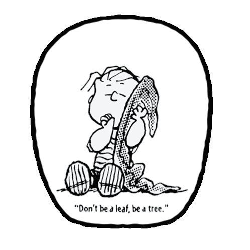 Linus Van Pelt from Peanuts, holding his security blanket, with the words "Mindfulness" and "Don't be a leaf, be a tree."