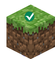 A pixelated Minecraft grass block with a green verified checkmark, representing VTC, gently rotating.
