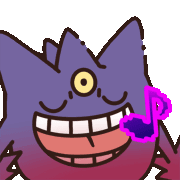 Animated sticker of Mega Gengar, the purple Pokemon, smiling widely with a single yellow eye, holding a pink music note.