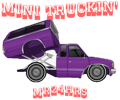 An animated mini truck lowrider with a dancing bed, featuring 'MINI TRUCKIN'' and 'MR24HRS' text, changing colors.