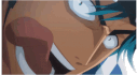 A close-up of Minibuha and Doubashi from Yowapeda, an anime character with blue hair, looking intense and wide-eyed.