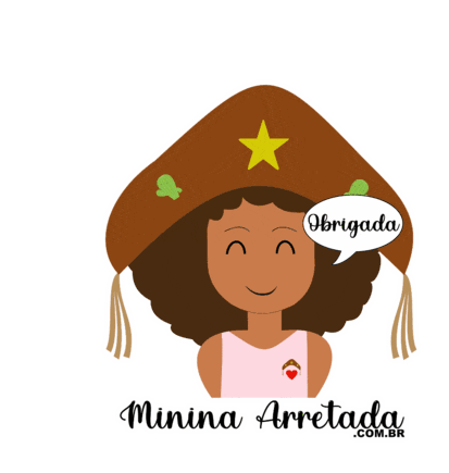 Minina Arretada, a cheerful cartoon girl in a traditional Brazilian hat, expresses gratitude with 'Obrigada'.