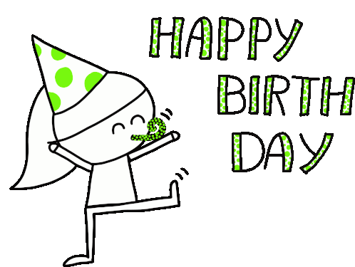 Minka celebrates her birthday, wearing a polka-dot party hat and blowing a party horn, with 'HAPPY BIRTH DAY' text.