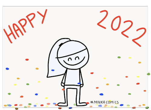 Minka Comics stick figure celebrates Happy New Year 2022 with colorful confetti, expressing joy and good wishes for the new year.