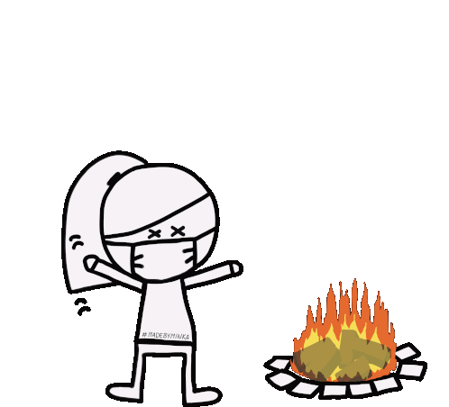 Minka, a stick figure character, happily removes her facemask and throws it into a campfire, saying "BYE".