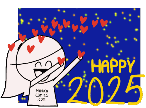 A cheerful Minka Comics cartoon girl with hearts and 'Happy 2025' wishes for the New Year.