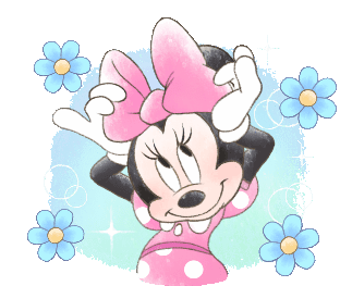 Minnie Mouse poses happily, adjusting her pink bow amidst sparkling blue flowers.
