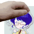 An animated drawing of Minnow Devilgender, a boy with glasses, held by a hand, blinks and moves his mouth.