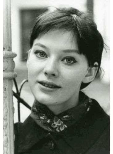 a black and white photo of a woman with short hair and a scarf around her neck